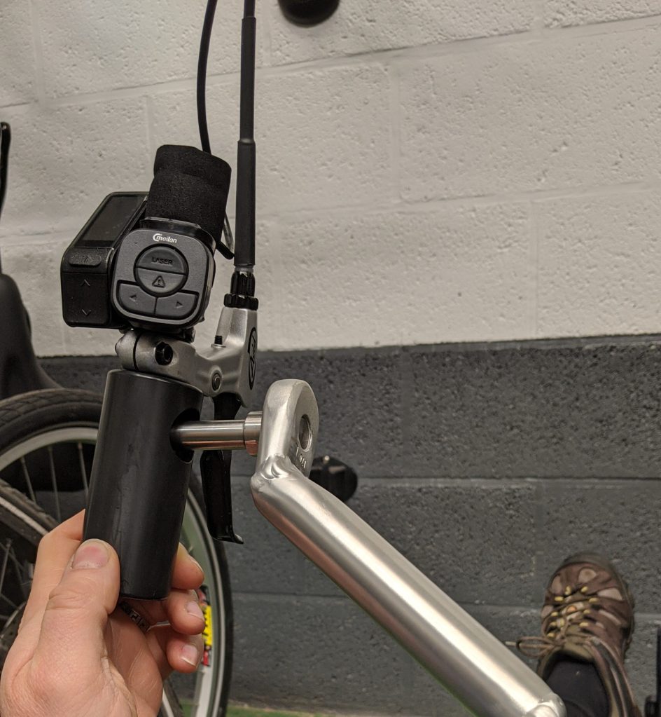 While the cranks were being made I worked on a simple mount for the new SW102 screen I plan to use with the motor as I needed a way of mounting this on the left handle in a un conventional way. As hand cyclists know not taking your hands of the bars is critical to smooth riding so I wanted a solution for Philip that would allow him to change power assist levels and still be able to keep his hand on the bars and keep rotating.